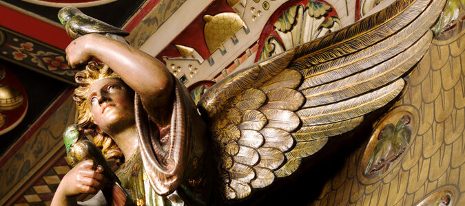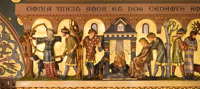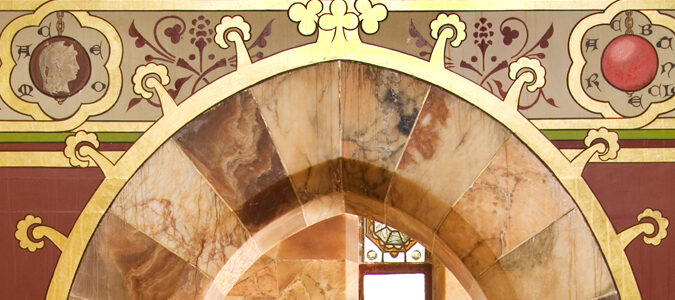 This room celebrates the pursuit of mineral wealth from the earth, an appropriate subject given that Lord Bute’s  vast fortune was derived from the coalfields of south Wales. Different types of gemstones are represented both by paintings on the walls and in the stained glass windows. The marble bathtub is said to have been converted from a Roman sarcophagus, purchased in Italy.