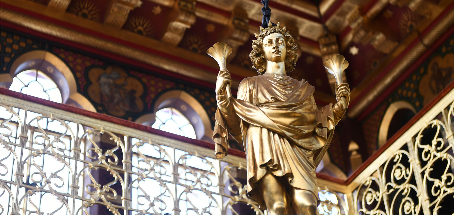 This room, at the very top of the Clock Tower, commands beautiful views and is undoubtedly one of the Castle’s most spectacular interiors. The theme here is the universe and the painted dome ceiling shows the night sky above the sun, represented by the golden chandelier. The pairs of figures at each corner of the room are the eight classical winds of antiquity.