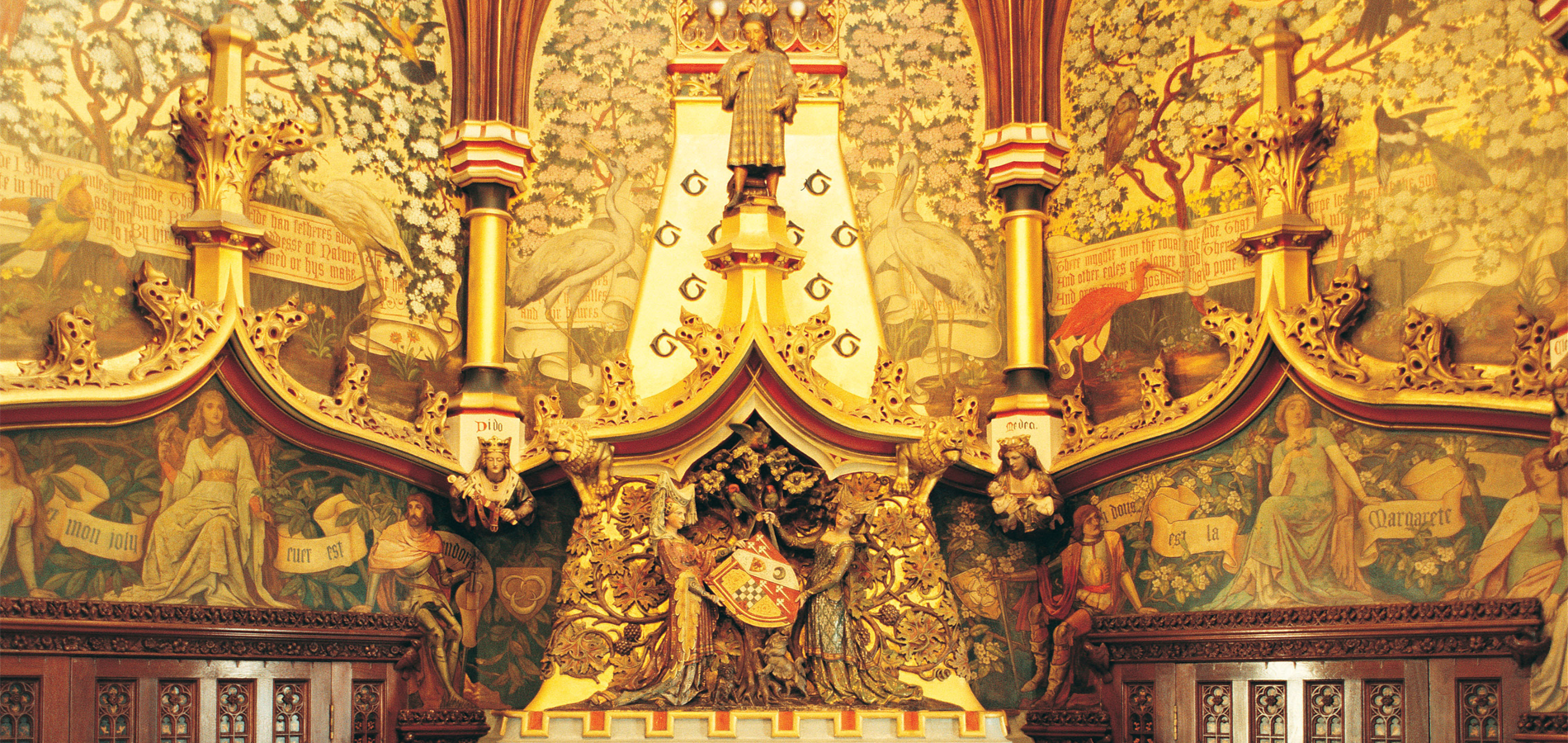 Although Burges created the room, he died before he could design the decoration, which dates from 1884. The wall canvasses, showing ‘The Parliament of birds,’ were painted by Charles Campbell, an artist Burges admired.