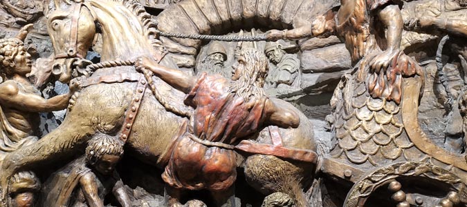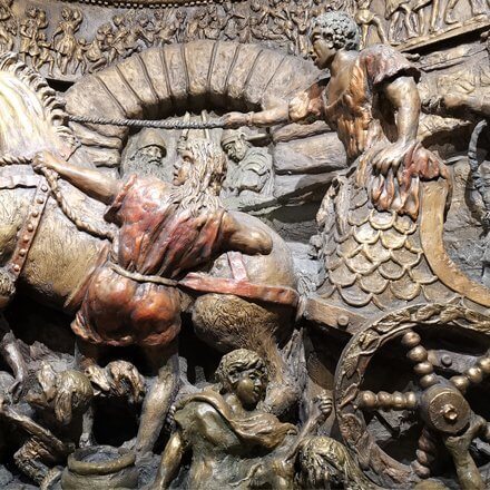 Hidden beneath the Castle’s south-east tower, situated opposite one of the remaining sections of Cardiff’s third century AD Roman fort, is an incredible mural made out of cement and plaster, finished in metallic gold paint. Commissioned by Cardiff City Council in the 1980s, the mural depicts scenes from the Roman invasion of the area and conflict with the local Silures tribe.