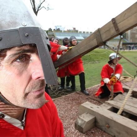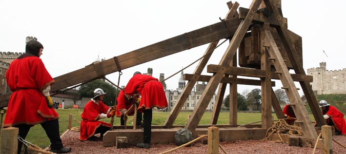The Trebuchet was one of the deadliest military machines of its time, using a sophisticated counter balance system to large stone projectiles with such a force that they could breach the strongest of fortifications. The example seen at Cardiff Castle was originally built by local set makers for the Hollywood movie, Ironclad.