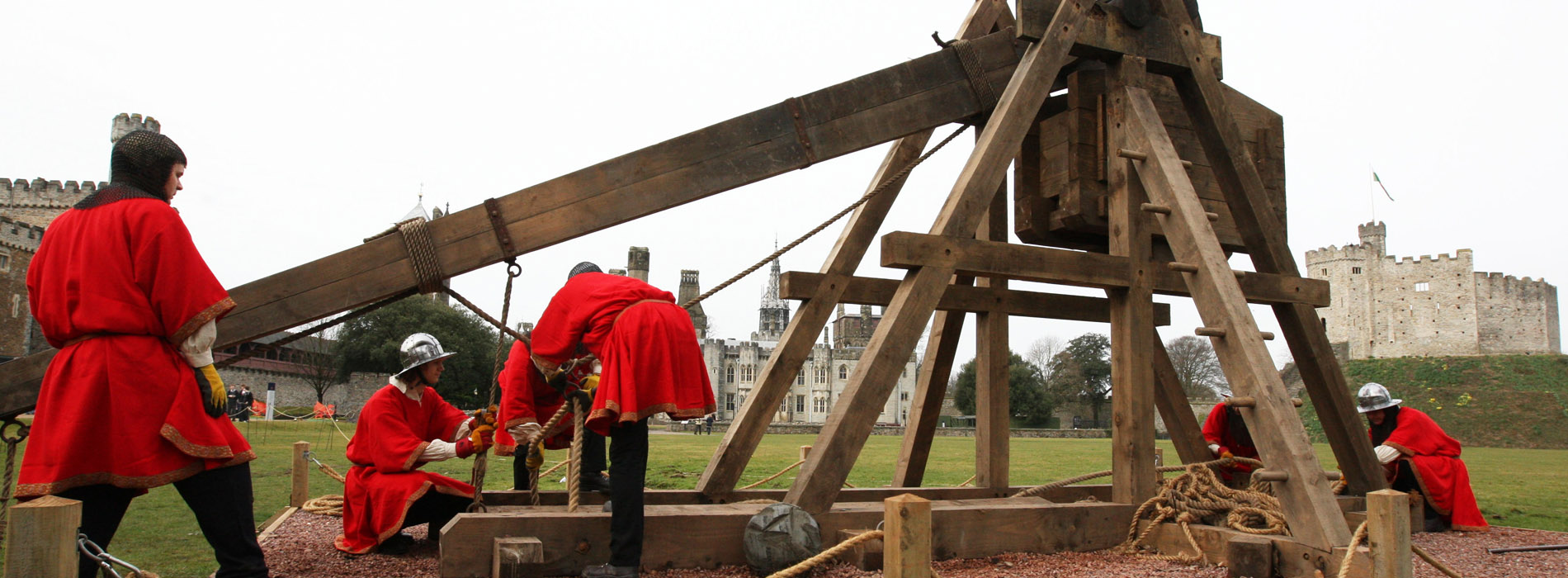 Located in a key position on outer green, the Trebuchet at Cardiff Castle is an historically accurate replica of a 13th Century siege engine standing at 10 metres (approx. 35 ft high) tall and weighing almost 6 tons.