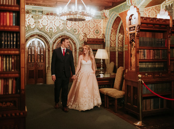 Created by the Bute family for grand entertaining, high ceilings and atmospheric lighting provide an unrivalled and spectacular setting for your wedding. It is the largest room in the Castle and its flamboyant decoration is typical of genius architect, William Burges, who created a Welsh Victorian Camelot for the 3rd Marquess of Bute. Drinks receptions can be served in the Library and, from there, guests can take the spectacular Octagon staircase up to the Banqueting Hall.